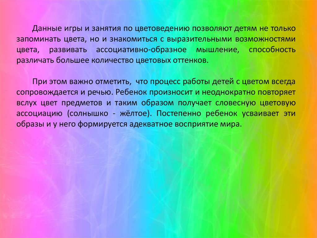Данные игры и занятия по цветоведению позволяют детям не толькозапоминать цвета, но и знакомиться с выразительными возможностями