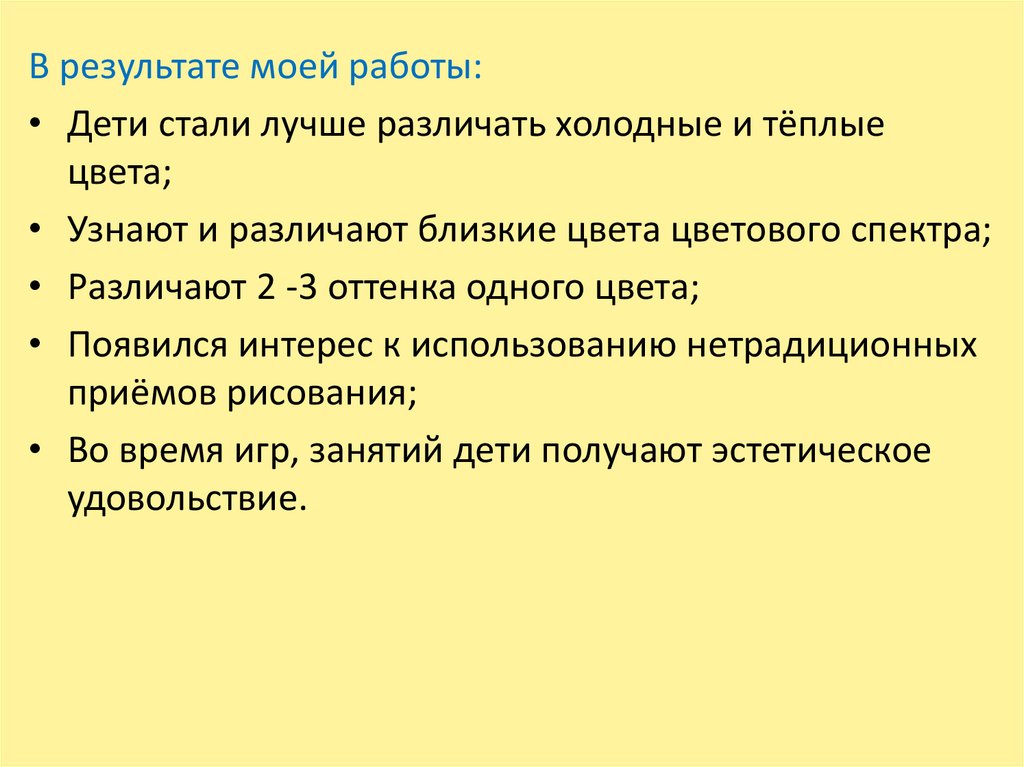 В результате моей работы:• Дети стали лучше различать холодные и тёплые