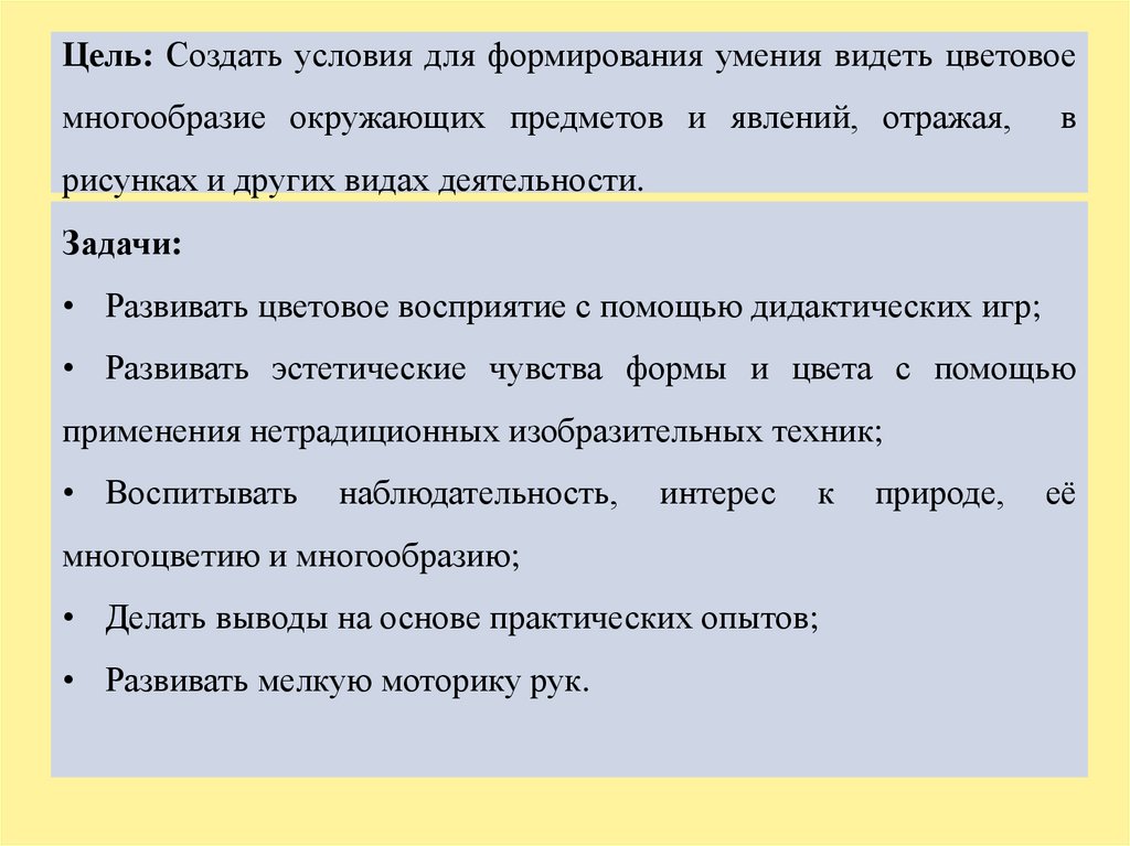 Цель: Создать условия для формирования умения видеть цветовоемногообразие окружающих предметов и явлений, отражая,