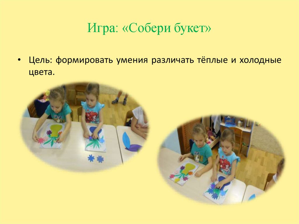 Игра: «Собери букет»• Цель: формировать умения различать тёплые и холодные