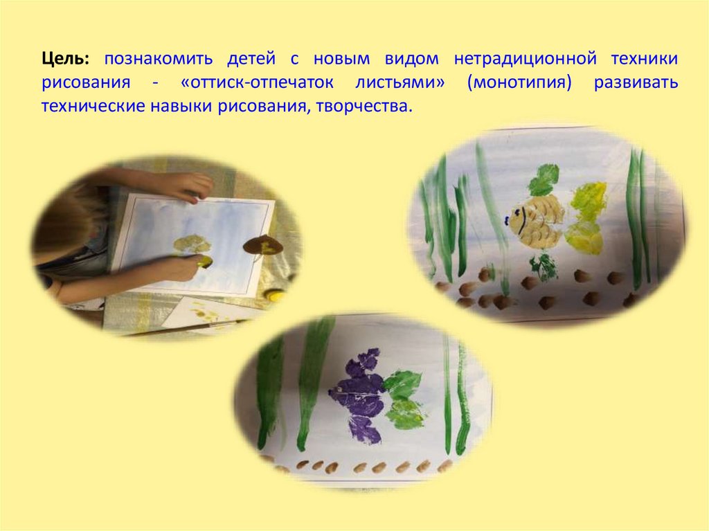 Цель: познакомить детей с новым видом нетрадиционной техникирисования - «оттиск-отпечаток листьями» (монотипия) развивать