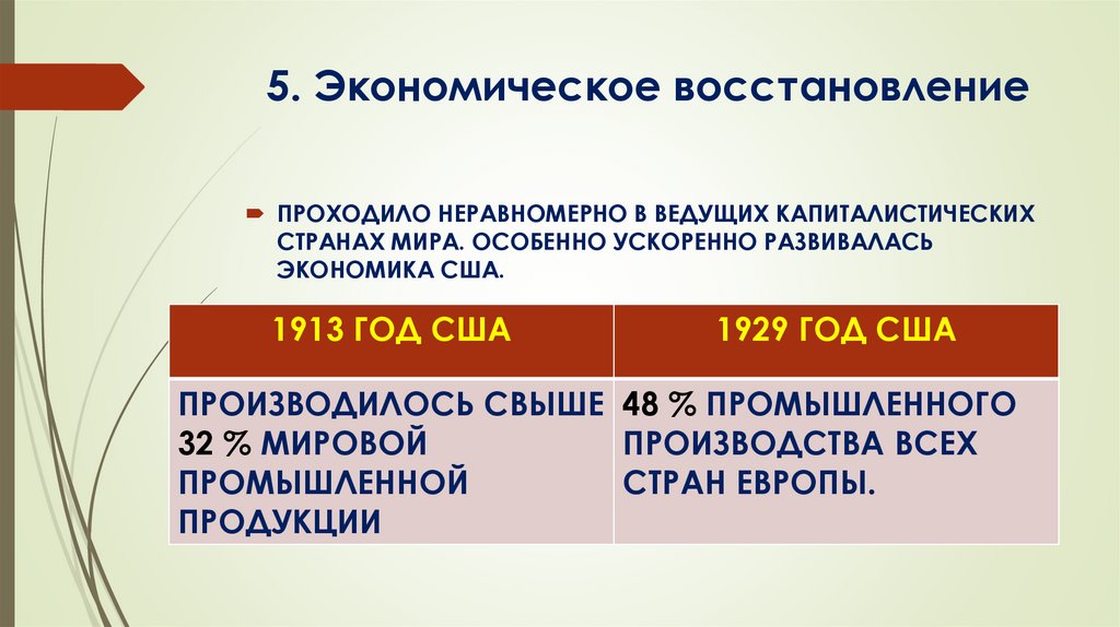 5. Экономическое восстановлениеПРОХОДИЛО НЕРАВНОМЕРНО В ВЕДУЩИХ КАПИТАЛИСТИЧЕСКИХ
