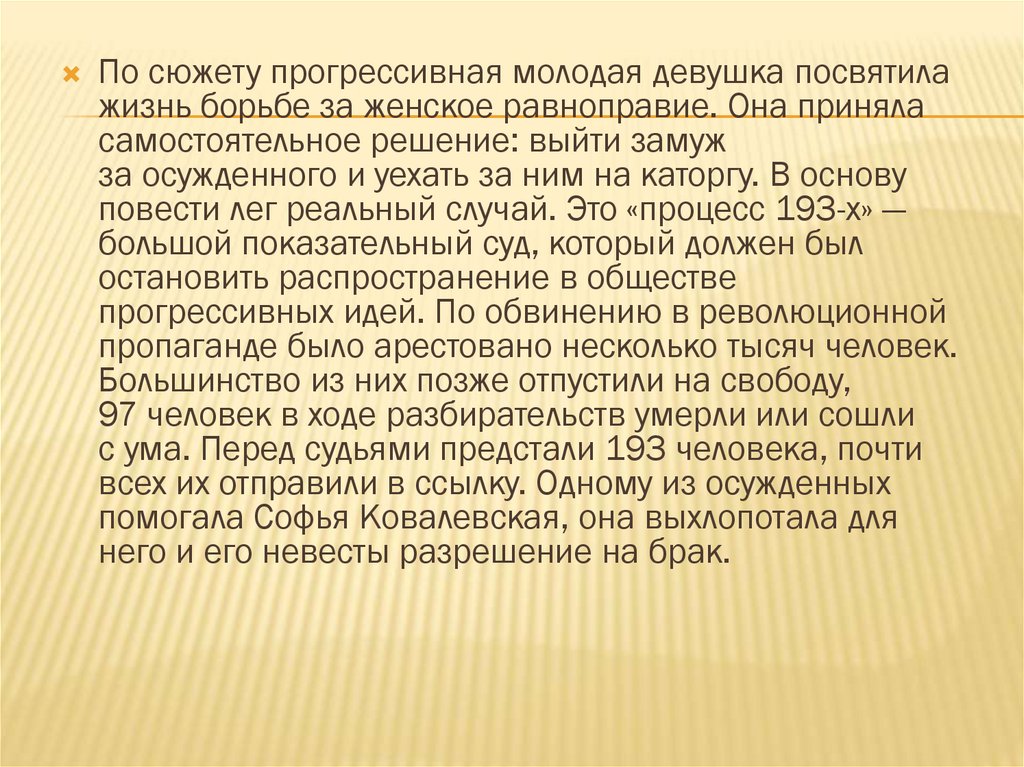 По сюжету прогрессивная молодая девушка посвятилажизнь борьбе за женское равноправие. Она приняла