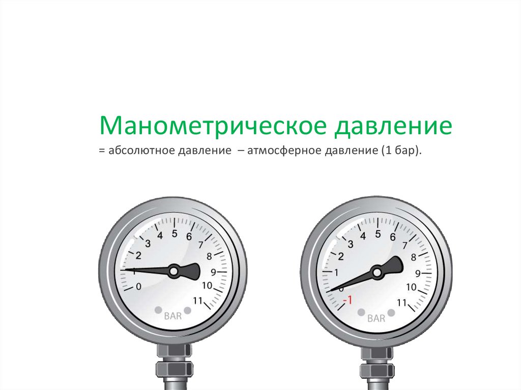 Манометрическое давление= абсолютное давление – атмосферное давление (1 бар).