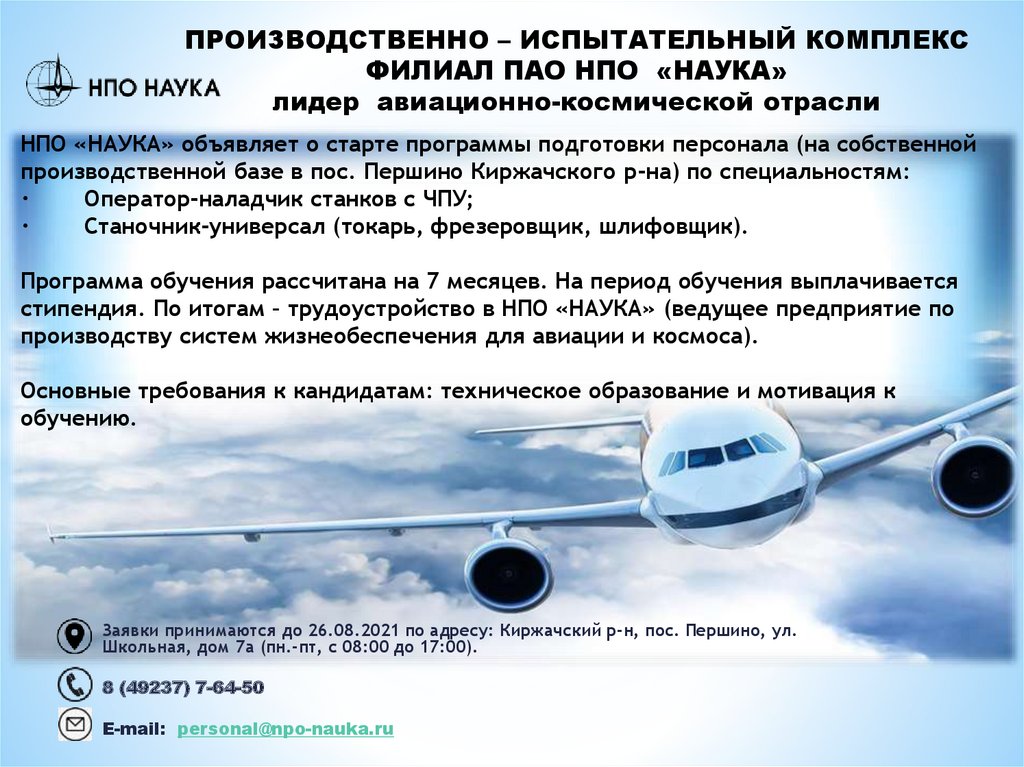 НПО «НАУКА» объявляет о старте программы подготовки персонала (на собственной