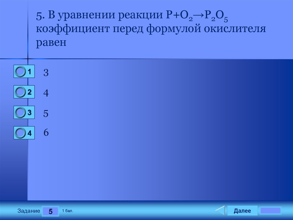 5. В уравнении реакции P+O2→P2O5коэффициент перед формулой окислителя