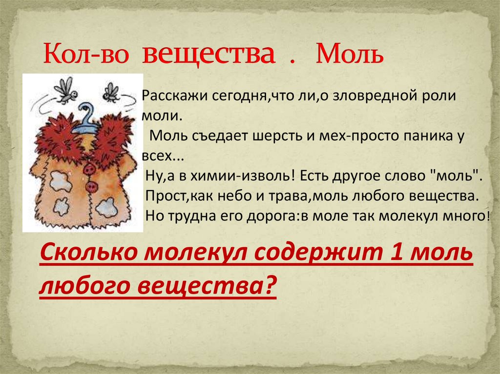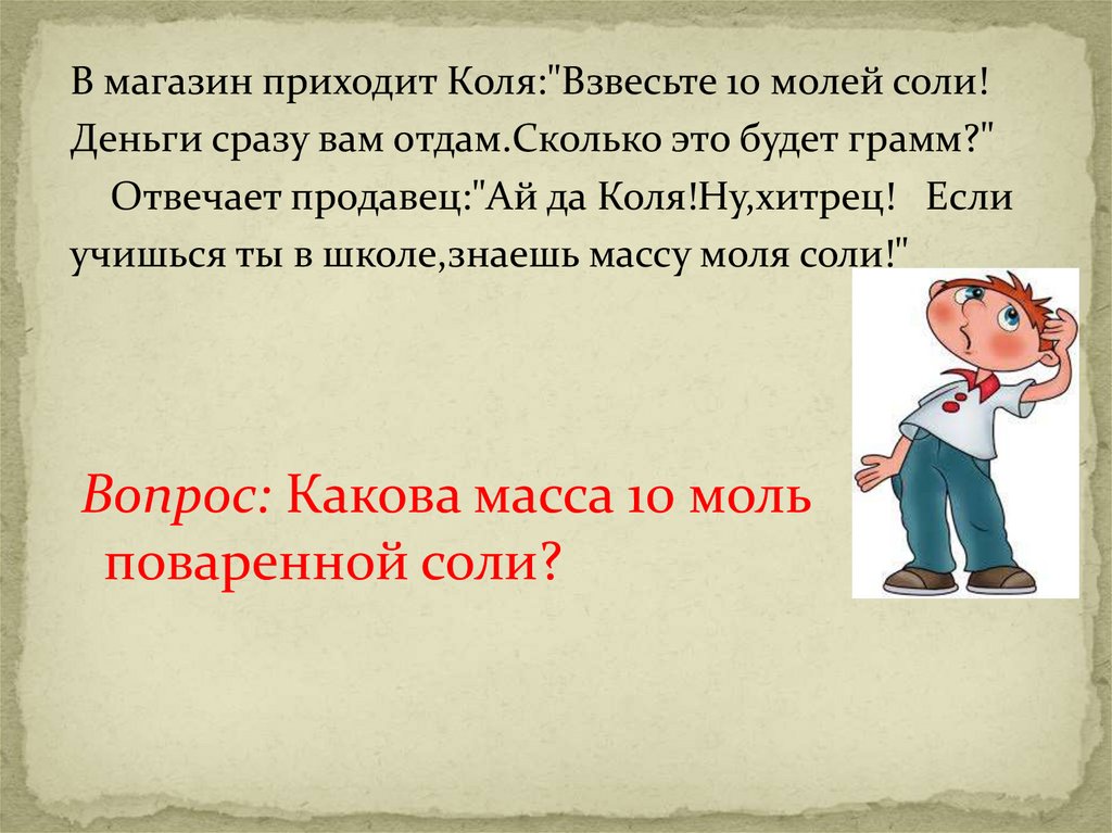 В магазин приходит Коля:"Взвесьте 10 молей соли!Деньги сразу вам отдам.Сколько это будет грамм?"