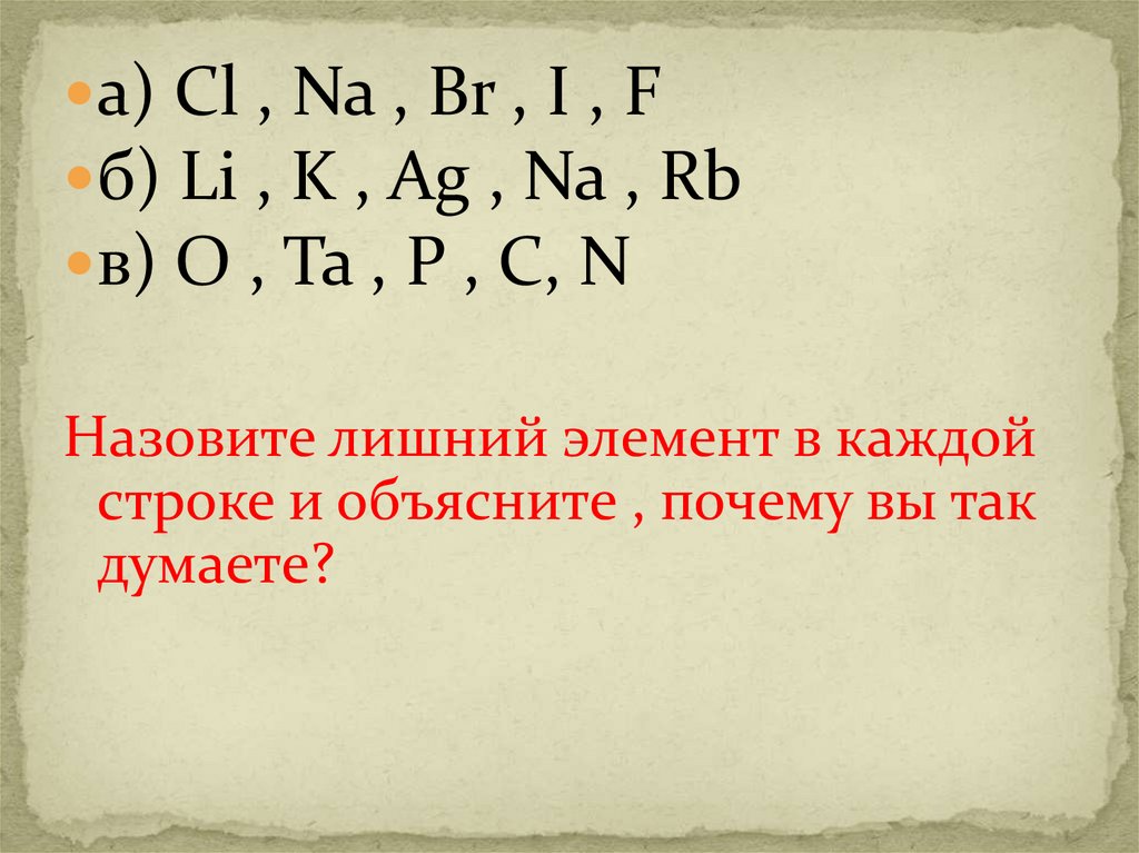 а) Cl , Na , Br , I , Fб) Li , K , Ag , Na , Rb