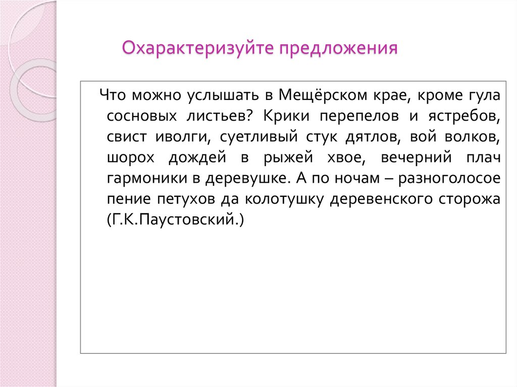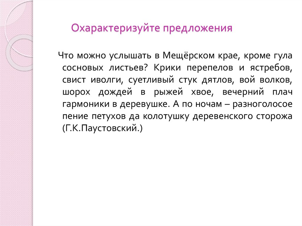 Охарактеризуйте предложенияЧто можно услышать в Мещёрском крае, кроме гула