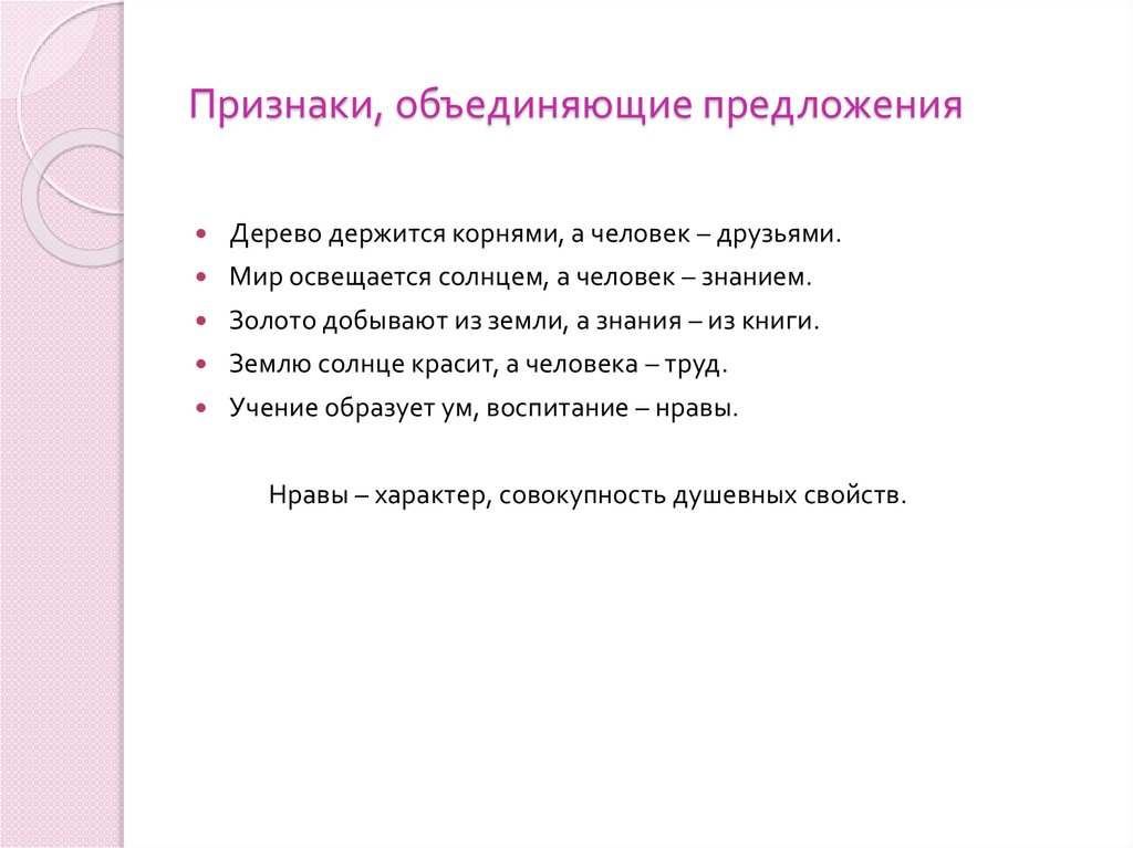 Признаки, объединяющие предложенияДерево держится корнями, а человек – друзьями.