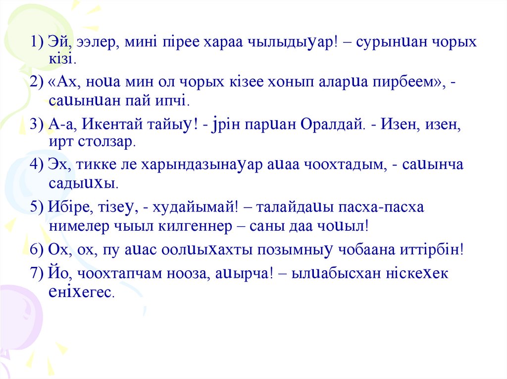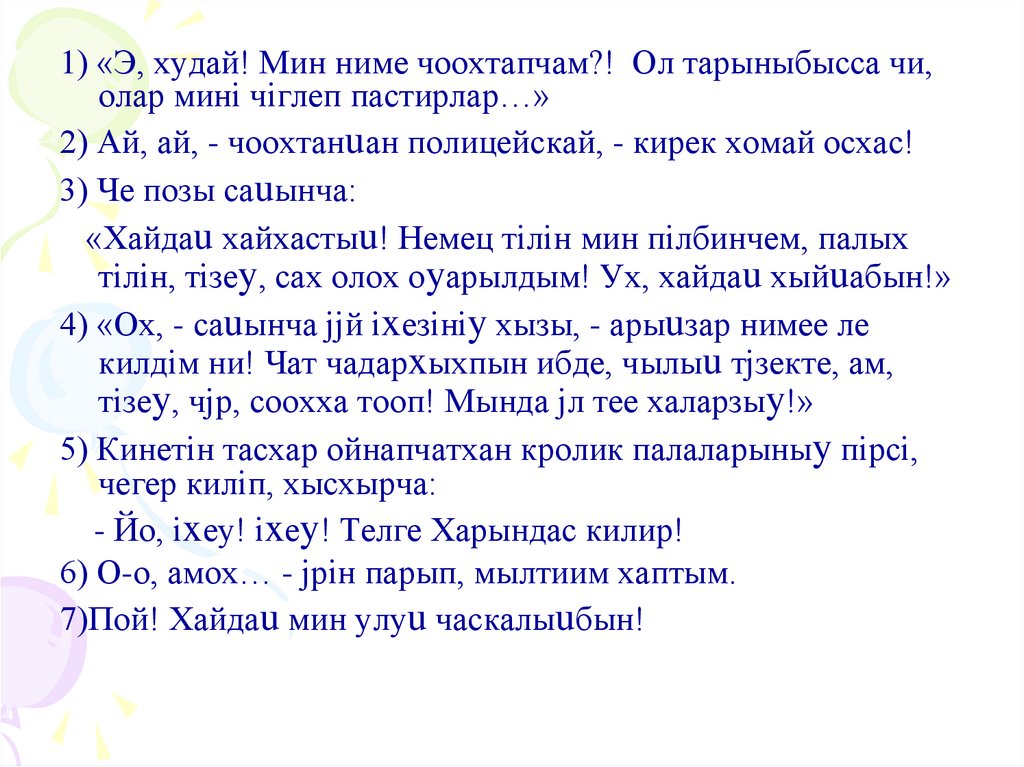 7) Йо, чоохтапчам нооза, аuырча! – ылuабысхан нiскеxек