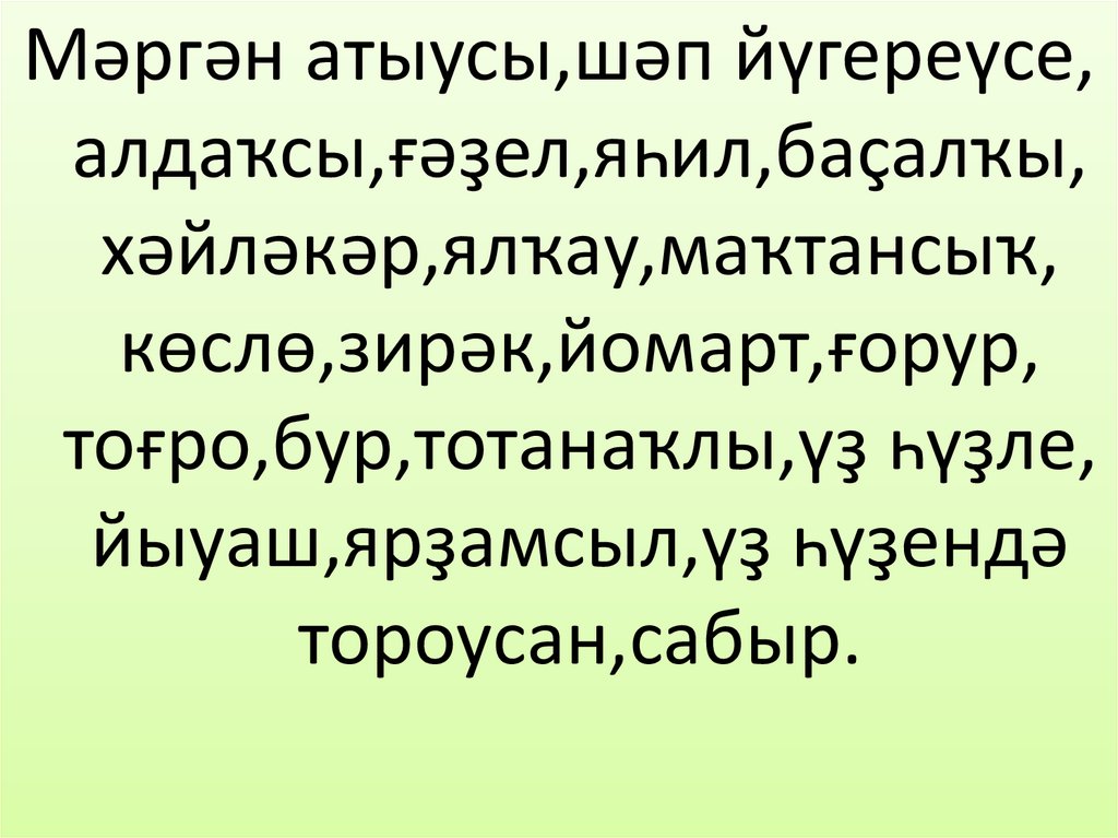 Мәргән атыусы,шәп йүгереүсе,алдаҡсы,ғәҙел,яһил,баҫалҡы,