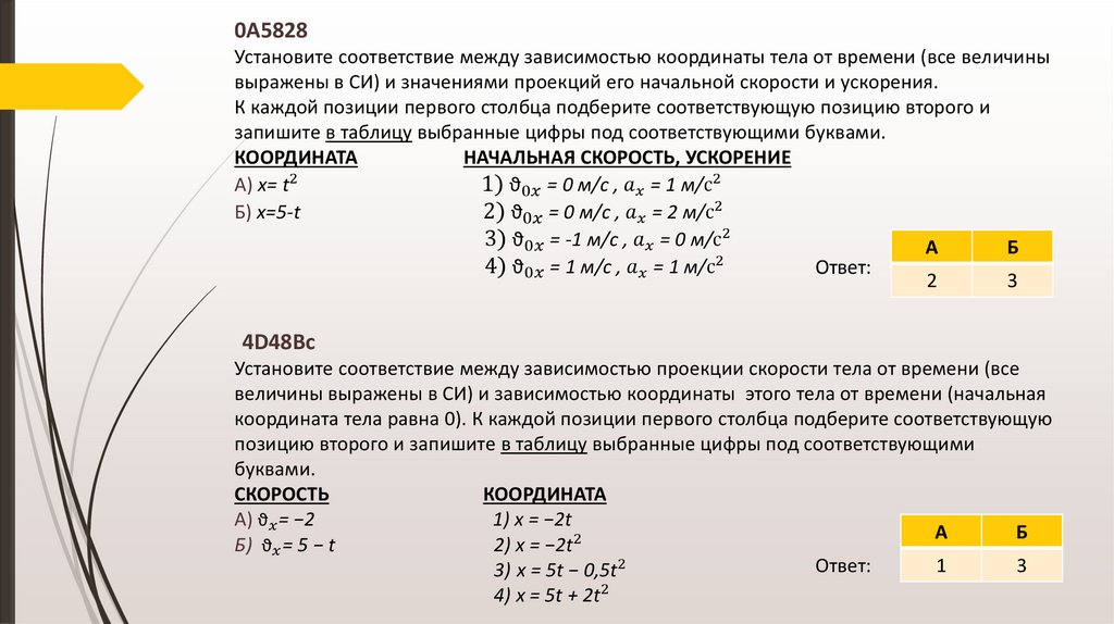 Четыре тела двигались по оси Ох. В таблице представлена зависимость их координат от времени.