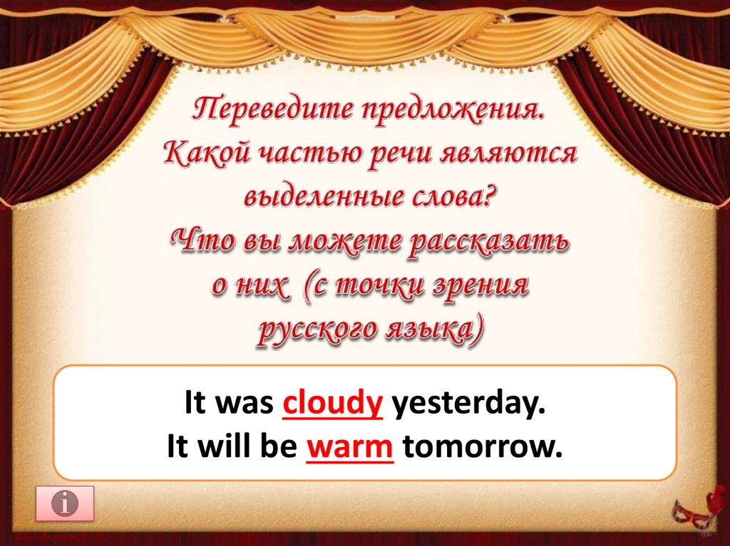 Наречия: облачно, тепло.