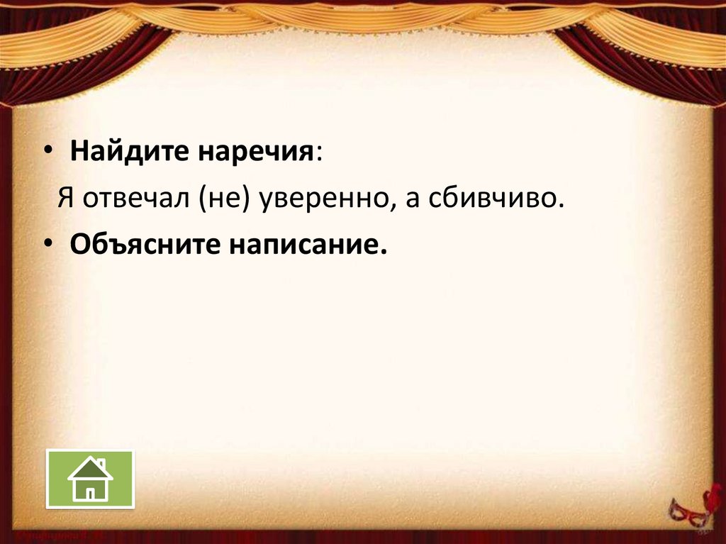 • Найдите наречия:Я отвечал (не) уверенно, а сбивчиво.