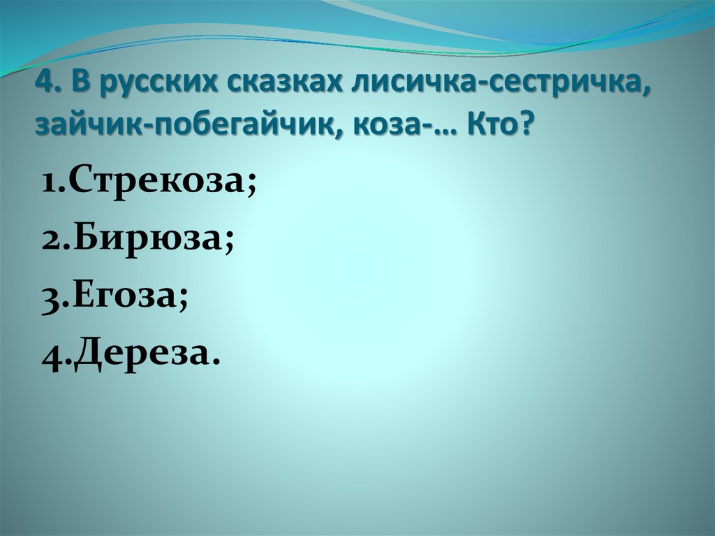 4. В русских сказках лисичка-сестричка,зайчик-побегайчик, коза-… Кто?