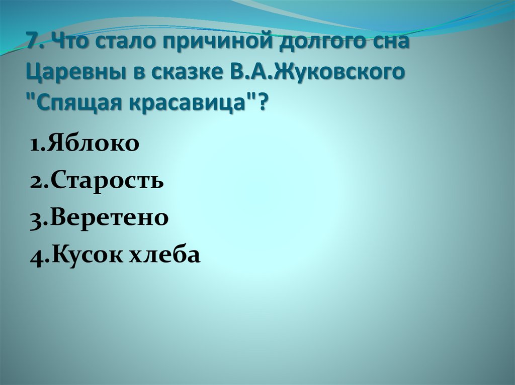 7. Что стало причиной долгого снаЦаревны в сказке В.А.Жуковского