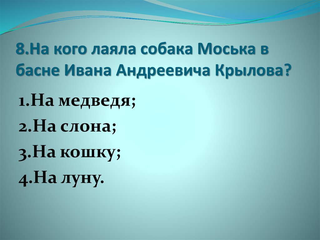 8.На кого лаяла собака Моська вбасне Ивана Андреевича Крылова?