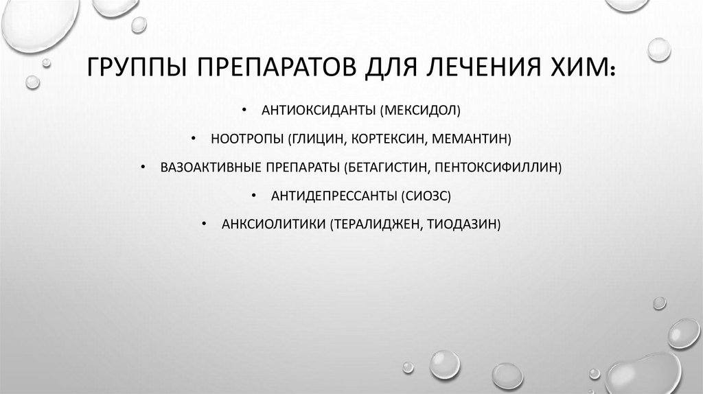 ГРУППЫ ПРЕПАРАТОВ ДЛЯ ЛЕЧЕНИЯ ХИМ:• АНТИОКСИДАНТЫ (МЕКСИДОЛ)