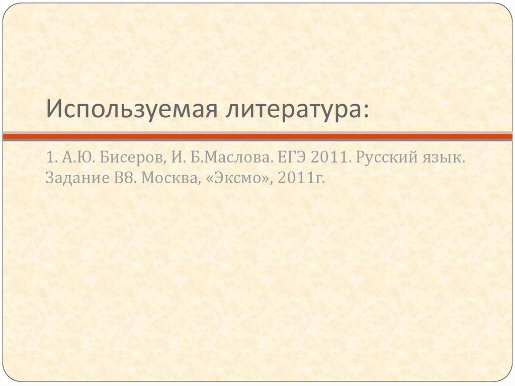 Используемая литература:1. А.Ю. Бисеров, И. Б.Маслова. ЕГЭ 2011. Русский язык.