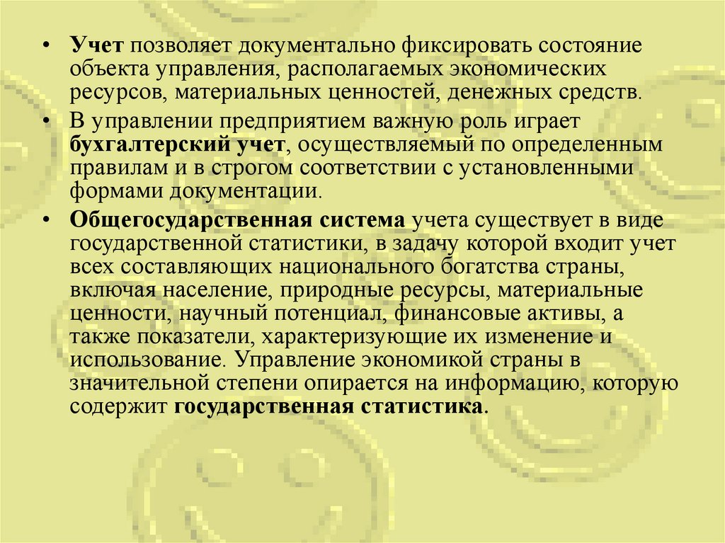 • Учет позволяет документально фиксировать состояниеобъекта управления, располагаемых экономических