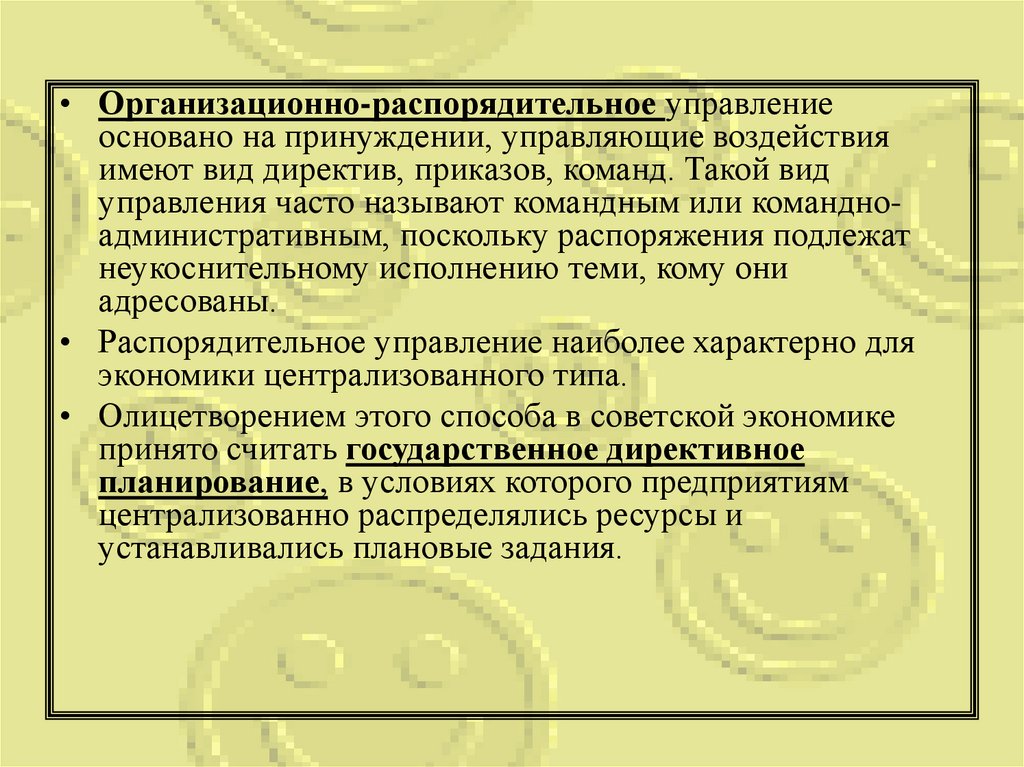 • Организационно-распорядительное управлениеосновано на принуждении, управляющие воздействия