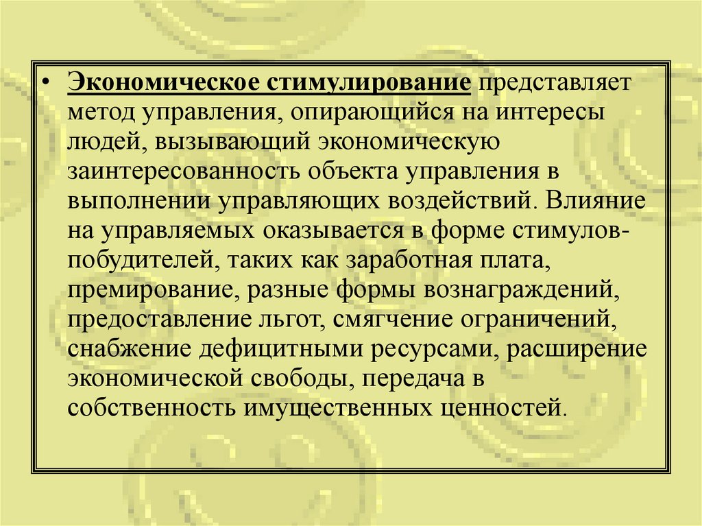 • Экономическое стимулирование представляетметод управления, опирающийся на интересы