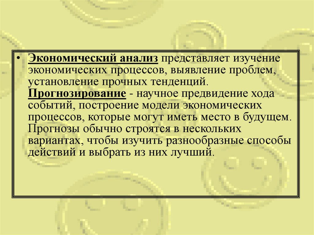 • Экономический анализ представляет изучениеэкономических процессов, выявление проблем,