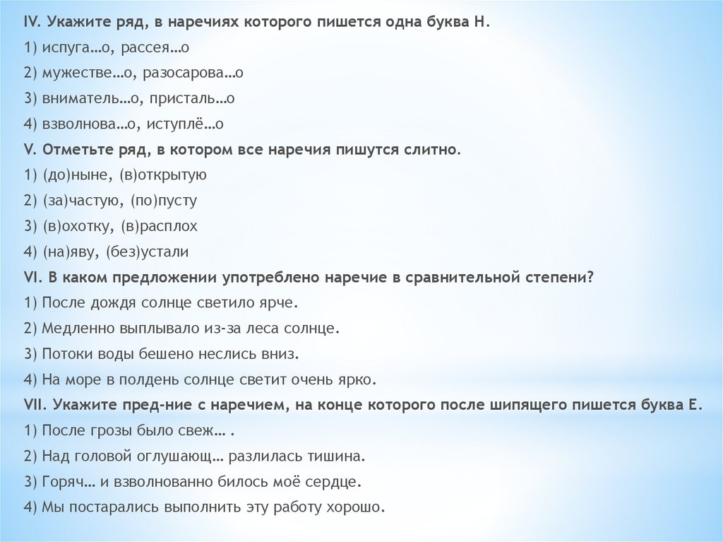 IV. Укажите ряд, в наречиях которого пишется две буквы НН.