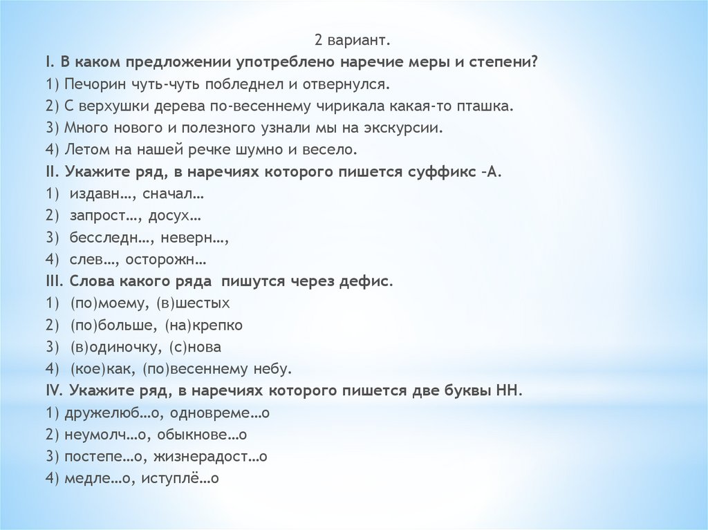 2 вариант.I. В каком предложении употреблено наречие меры и степени?