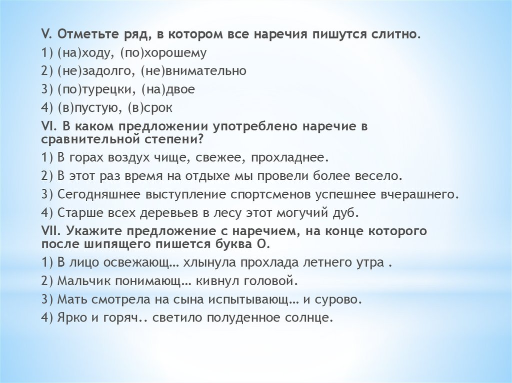 VI. В каком предложении употреблено наречие в сравнительной степени?