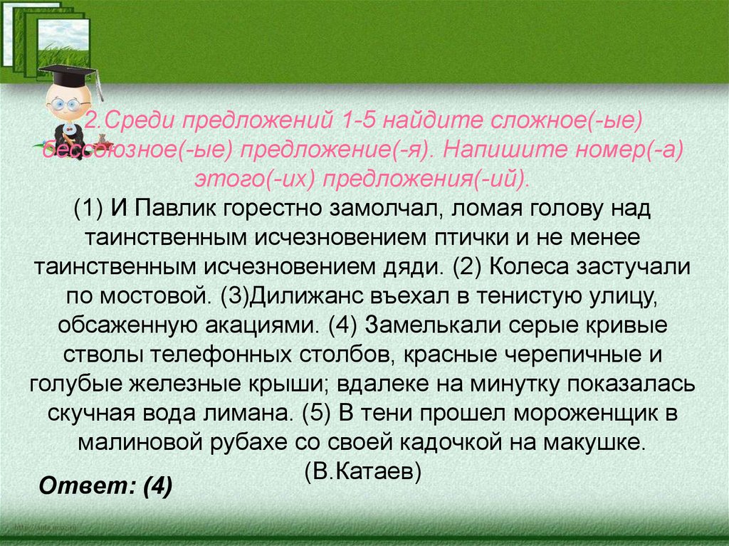 2.Среди предложений 1-5 найдите сложное(-ые)бессоюзное(-ые) предложение(-я). Напишите номер(-а)