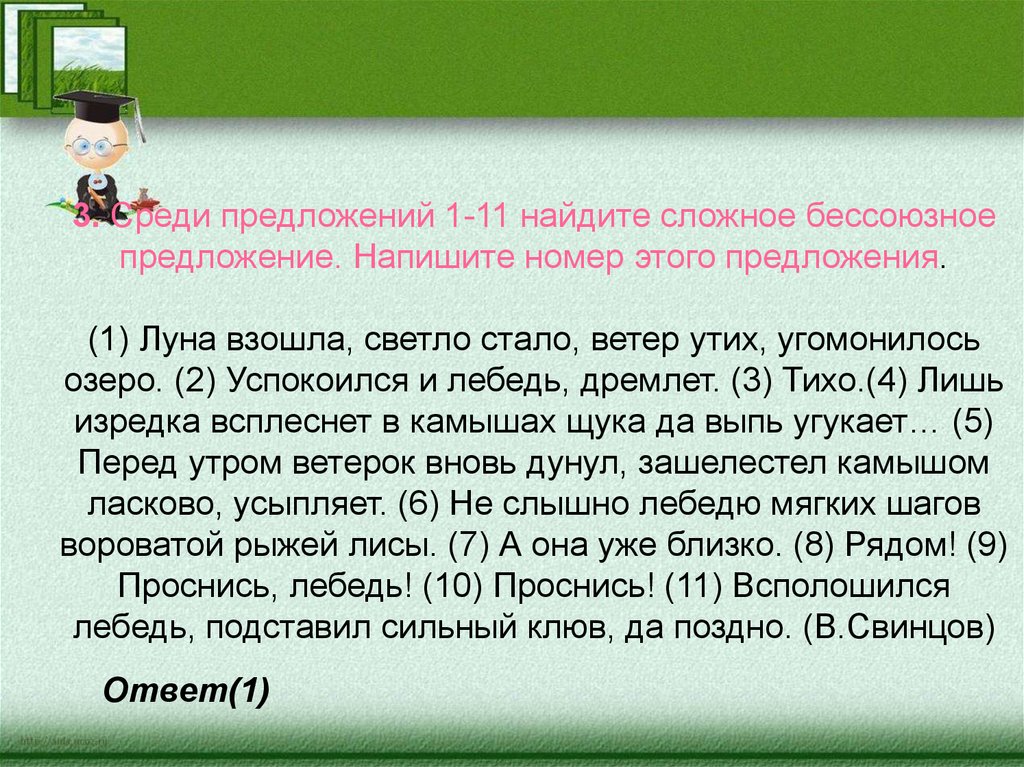 3. Среди предложений 1-11 найдите сложное бессоюзноепредложение. Напишите номер этого предложения.