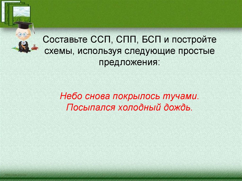 Составьте ССП, СПП, БСП и постройтесхемы, используя следующие простые