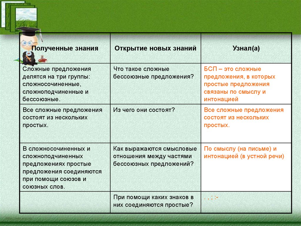 Полученные знанияСложные предложения делятся на три группы: