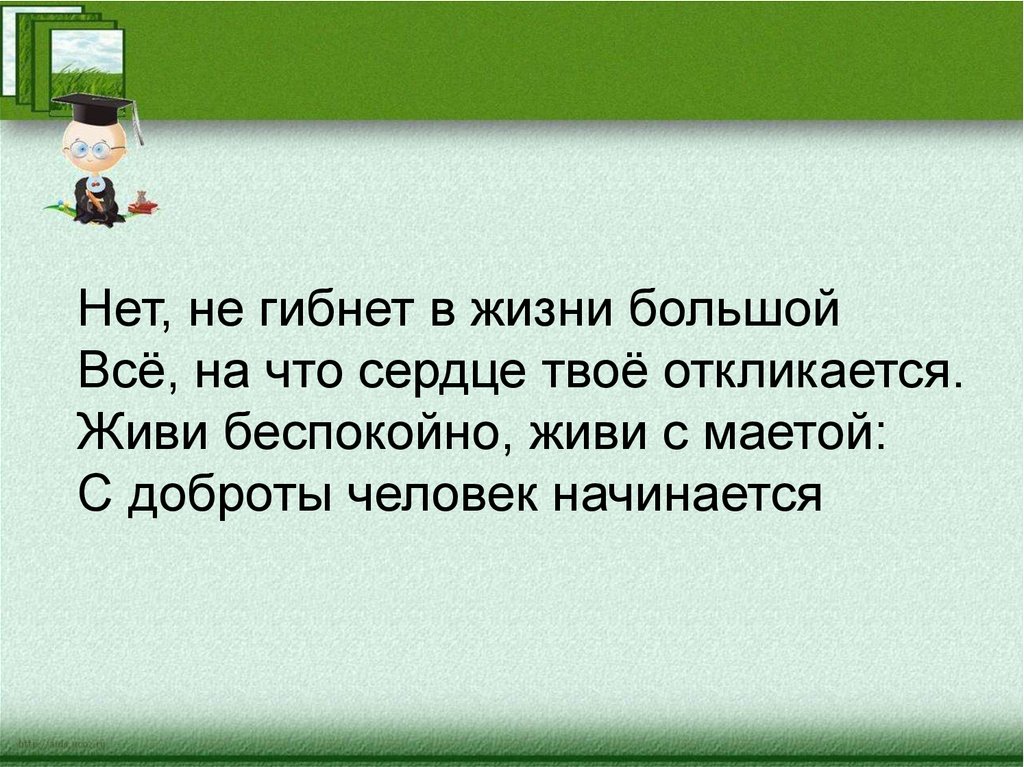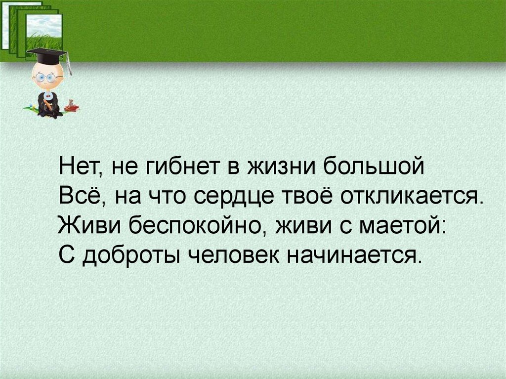 Нет, не гибнет в жизни большойВсё, на что сердце твоё откликается.
