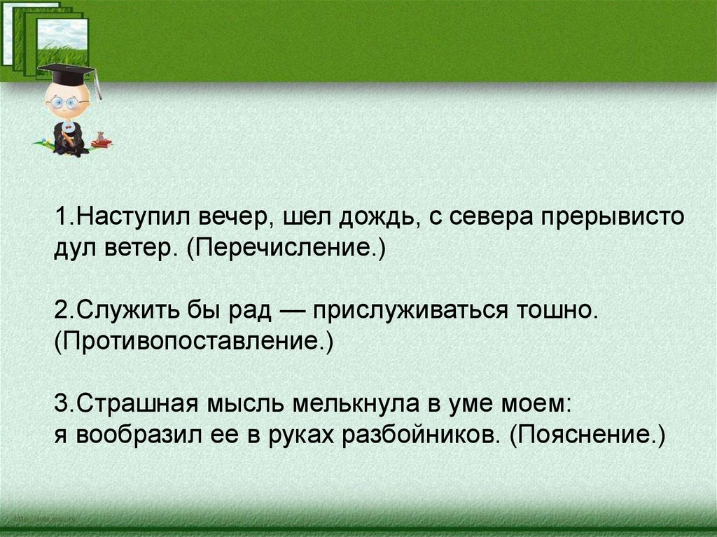 1.Наступил вечер, шел дождь, с севера прерывистодул ветер. (Перечисление.)