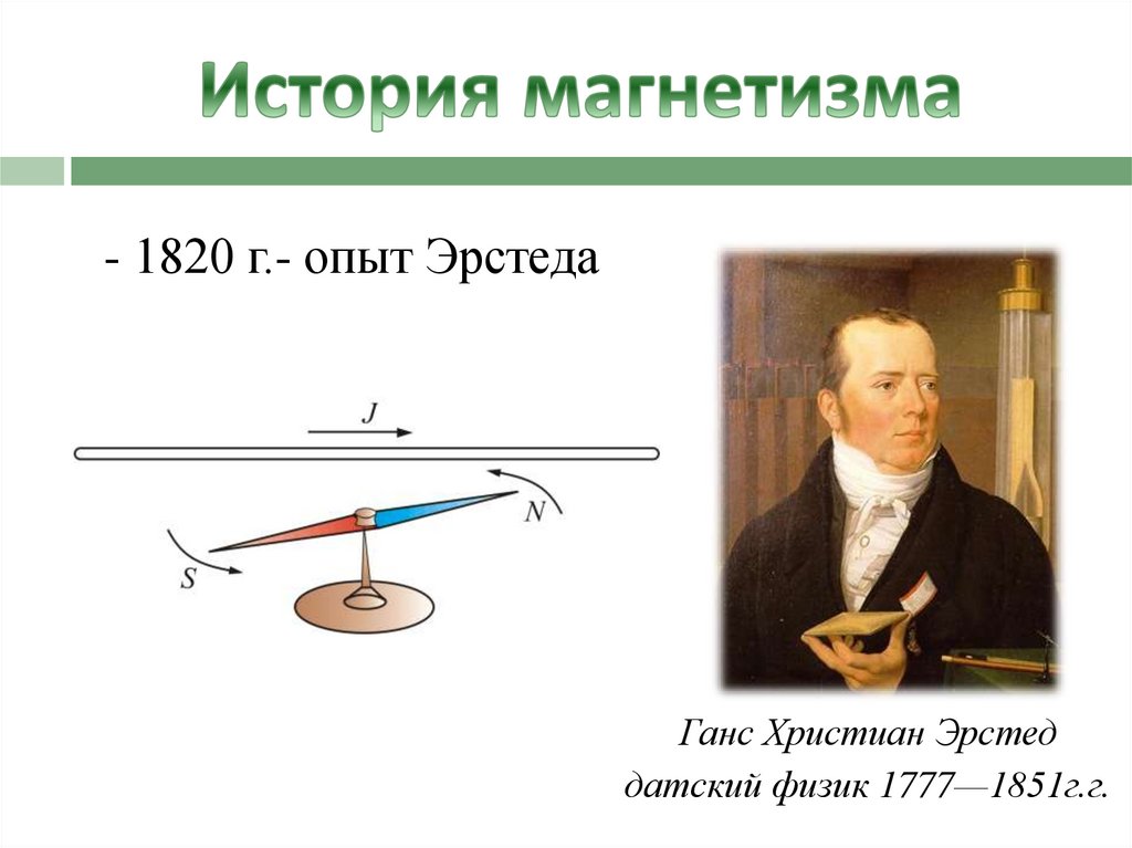 - 1820 г.- опыт ЭрстедаГанс Христиан Эрстед