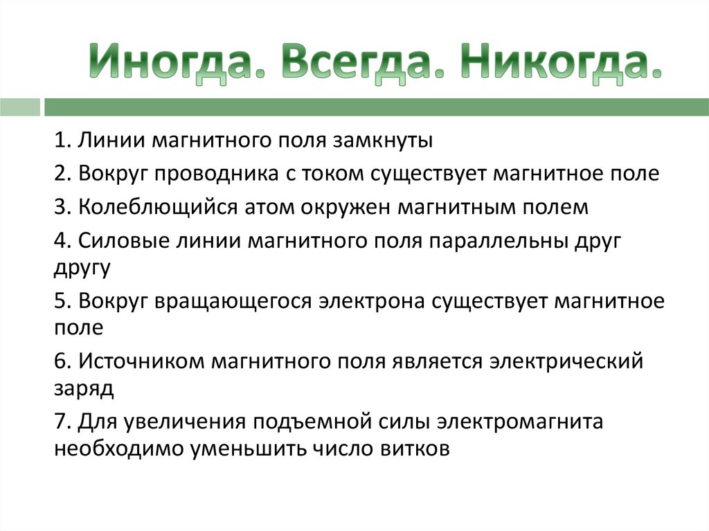 1. Линии магнитного поля замкнуты2. Вокруг проводника с током существует магнитное поле
