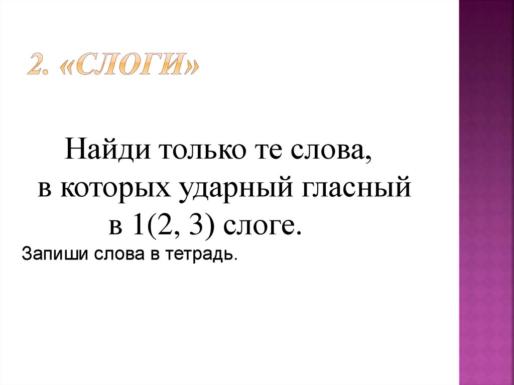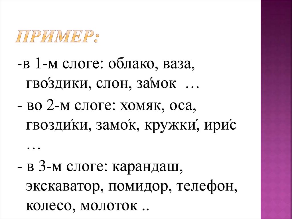 -в 1-м слоге: облако, ваза,гво́здики, слон, за́мок …