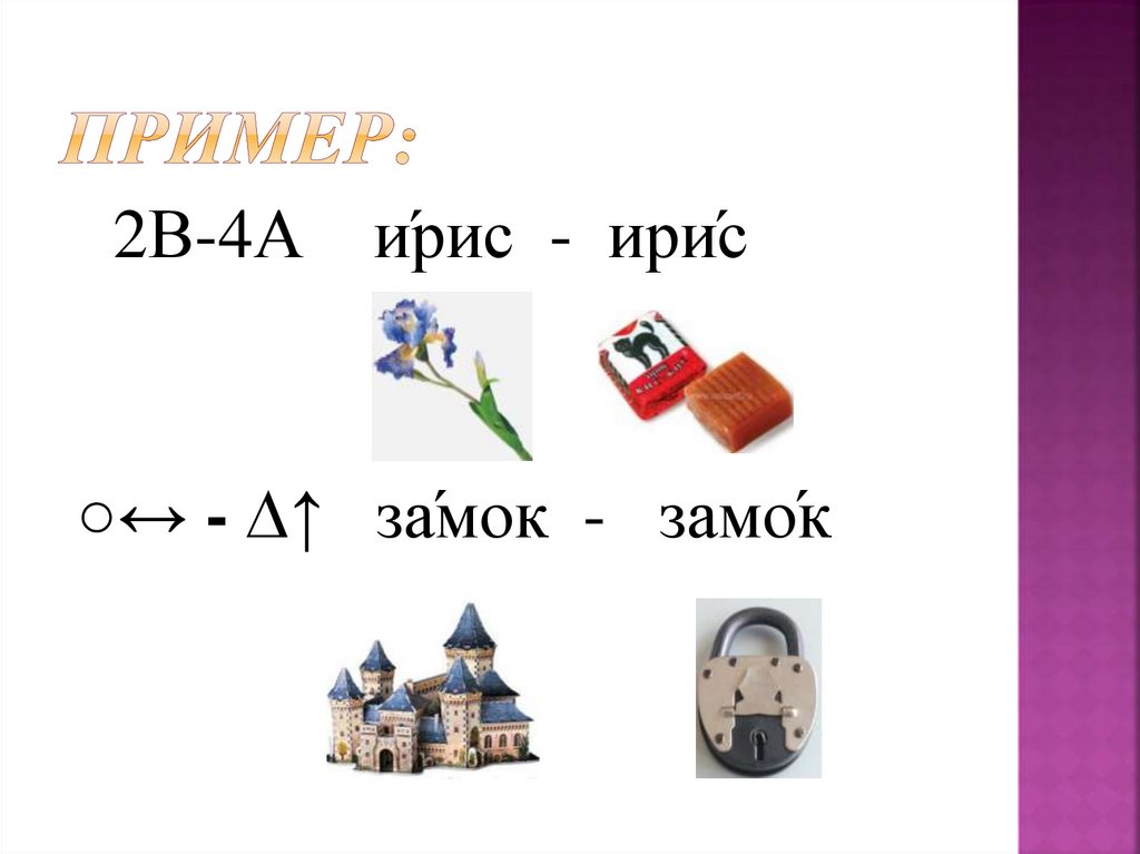 2В-4А и́рис - ири́с○↔ - ∆↑ за́мок - замо́к