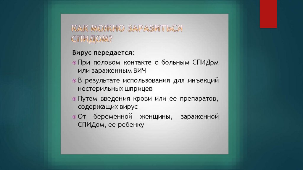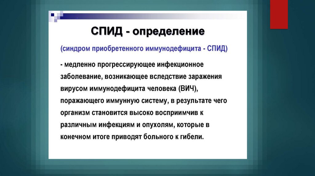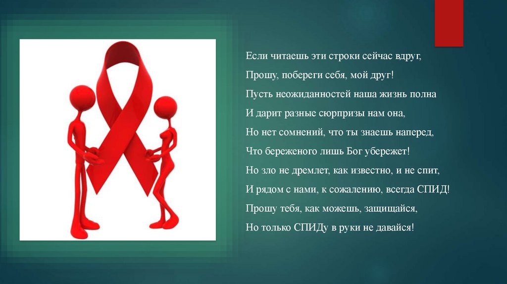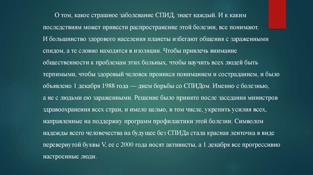 О том, какое страшное заболевание СПИД, знает каждый. И к какимпоследствиям может привести распространение этой болезни, все понимают.