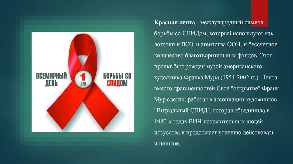объявлено 1 декабря 1988 года — днем борьбы со СПИДом. Именно с болезнью,
