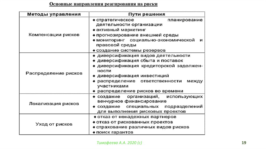 Основные направления реагирования на рискиТимофеева А.А. 2020 (с)