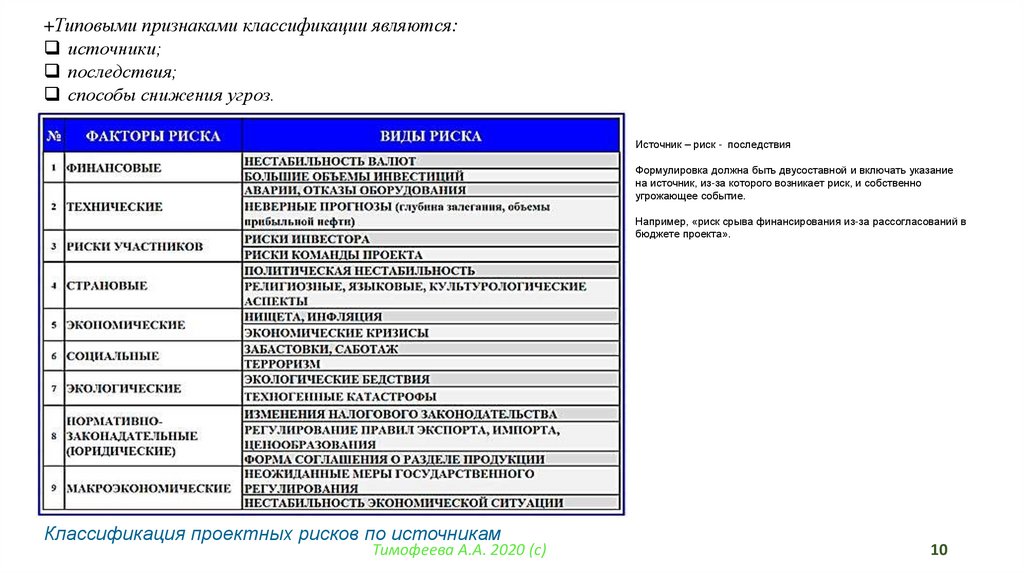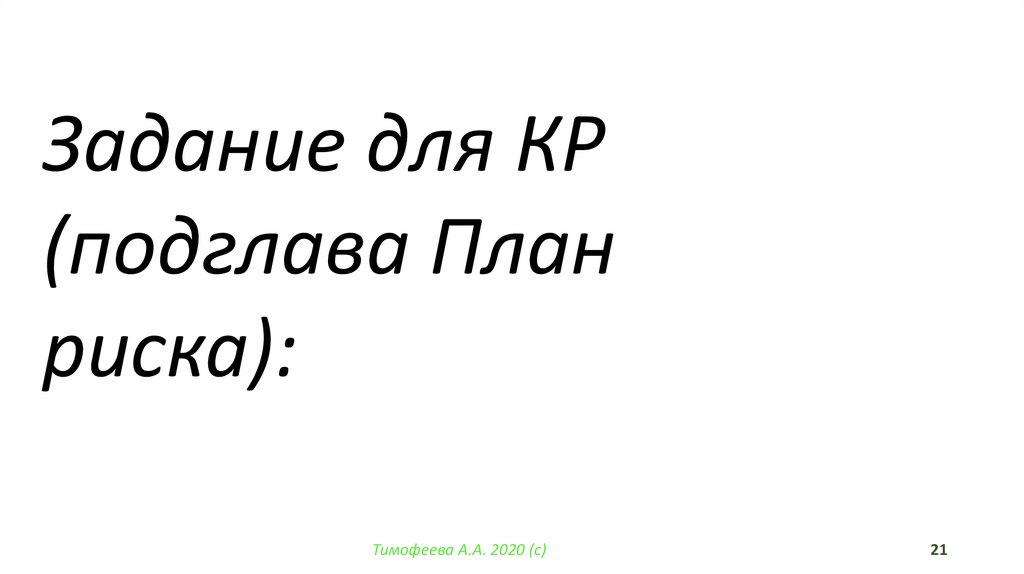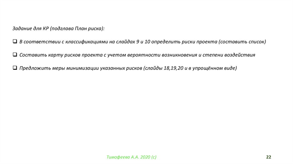Задание для КР (подглава План риска):В соответствии с классификациями на слайдах 9 и 10 определить риски проекта (составить список)