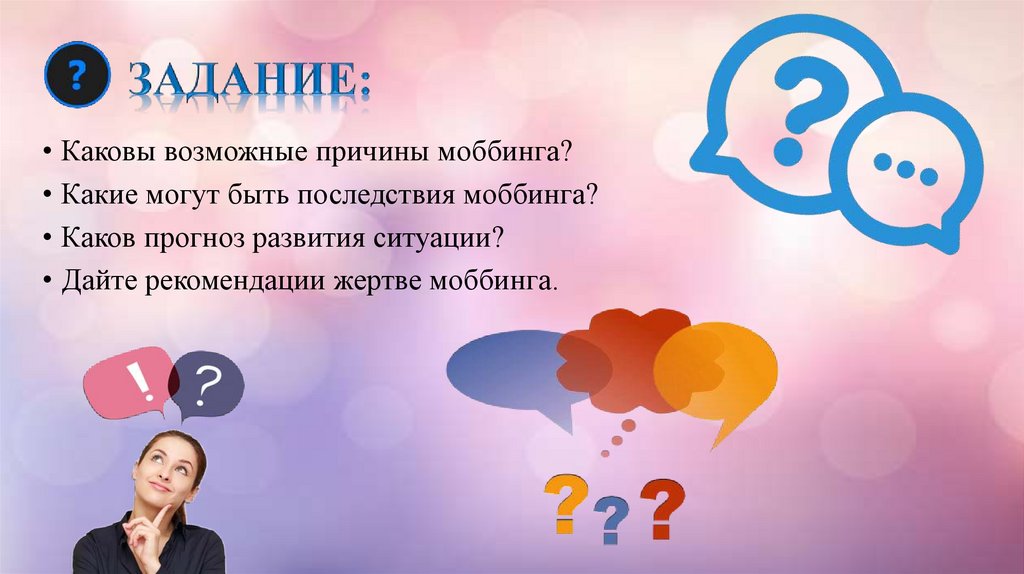 • Каковы возможные причины моббинга?• Какие могут быть последствия моббинга?