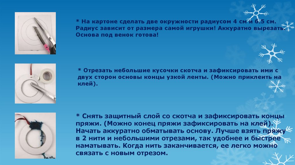 * Когда основа обмотана, зафиксировать концы пряжидвусторонним скотчем с двух сторон. (Можно