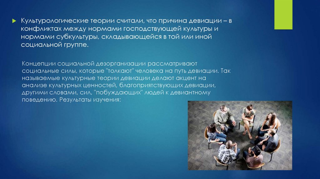 Культурологические теории считали, что причина девиации – вконфликтах между нормами господствующей культуры и