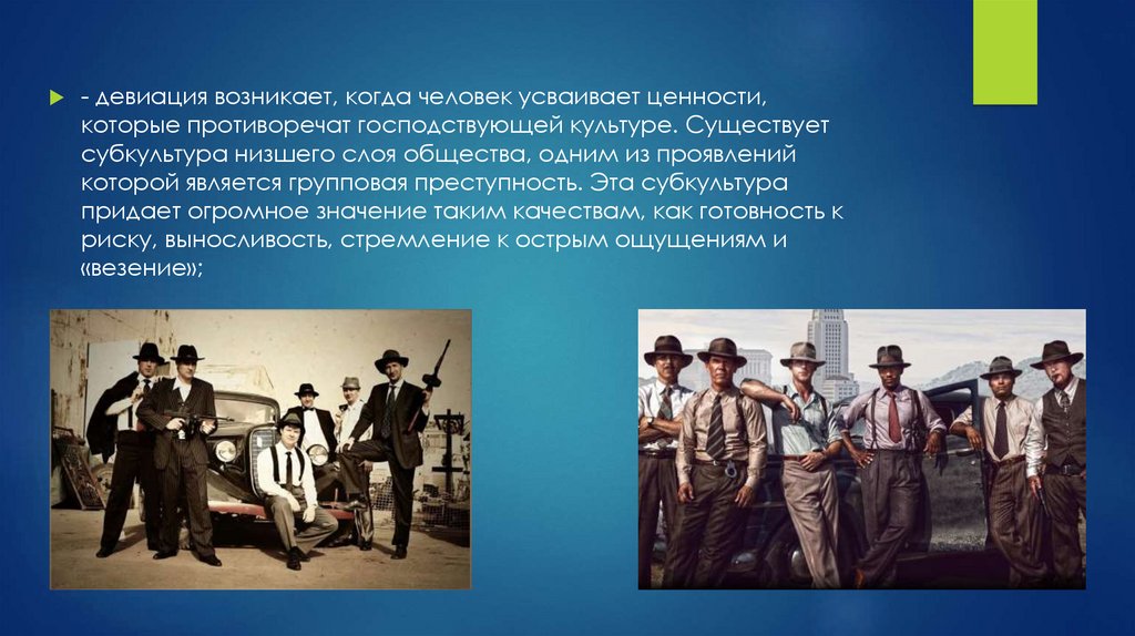 - девиация возникает, когда человек усваивает ценности,которые противоречат господствующей культуре. Существует