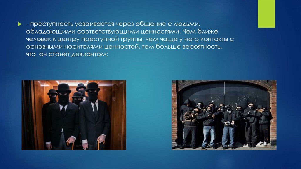 - преступность усваивается через общение с людьми,обладающими соответствующими ценностями. Чем ближе